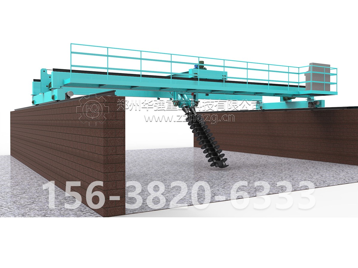 雙螺旋翻堆機(jī)由前后行走裝置、左右行走裝置、旋葉升降裝置、旋葉旋轉(zhuǎn)動力裝置、PLC控制柜等主要部件組成。該機(jī)型克服了普通旋耕槽式翻堆機(jī)翻堆深度淺、翻堆跨度小、占地面積大的問題,本設(shè)備的有效翻堆能達(dá)到1.7米、有效翻堆跨度能達(dá)到6-11米,從而大大改善了工作場地的利用率,特別適用于污泥、城市垃圾等低有機(jī)質(zhì)物料的發(fā)酵(由于有機(jī)質(zhì)含量低,需要有發(fā)酵深度才能提高發(fā)酵溫度,從而減少發(fā)酵時間)。該設(shè)備利用兩根互相嚙合、轉(zhuǎn)向相反的螺旋葉片將發(fā)酵槽底部的物料翻送到上部,同時又做橫向移動和縱向移動,使物料和空氣中的氧氣能夠充分的接觸,從而起到好氧發(fā)酵和翻堆降溫的作用。 本設(shè)備配備PLC程序化控制柜,可實現(xiàn)手動或自動控制功能,還可以配備遙控裝置,達(dá)到準(zhǔn)確操作。